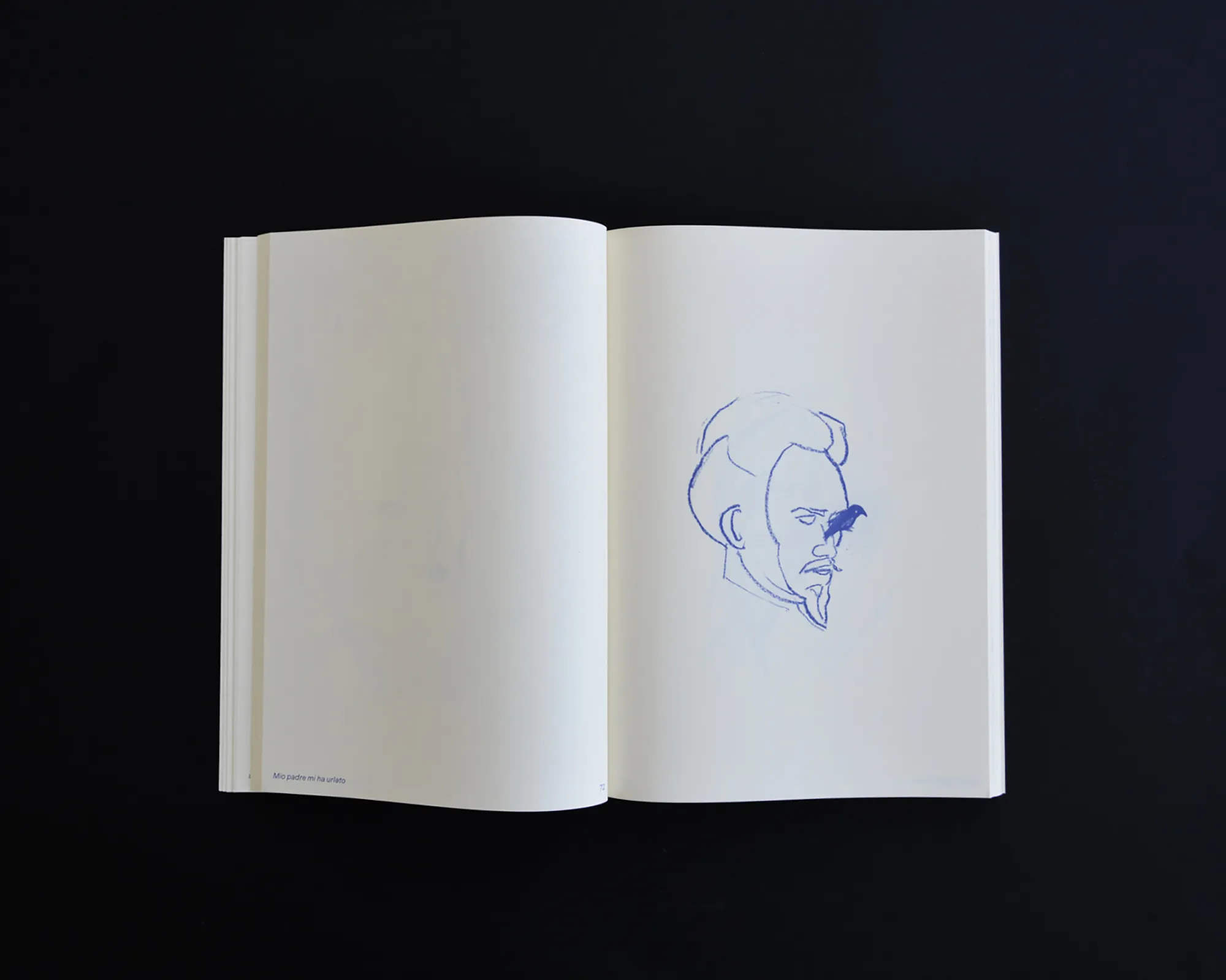 "Exercises on Ezra" is an artist's book by Enzo Cucchi built around a core of iterative and "postural" drawings of Ezra Pound made by the artist, as well as around the untitled diptych (Pound), an anti-memorial work on the poet, spatial fire and research of the Antifragile exhibition at COLLI, Rome. The book is a collection of drawings, fragments, and annotations that serve as a background to the central focus of Pound portraits, entering into relationship with each other also thanks to the text "Il Grano" (The Grain), written by Giuseppe Cucchi and Brunella Antomarini. The text unfolds fragmentarily, reconstituting itself at the end of the volume for a compact but reference-laden reading, in continuous relation with the visual elements.